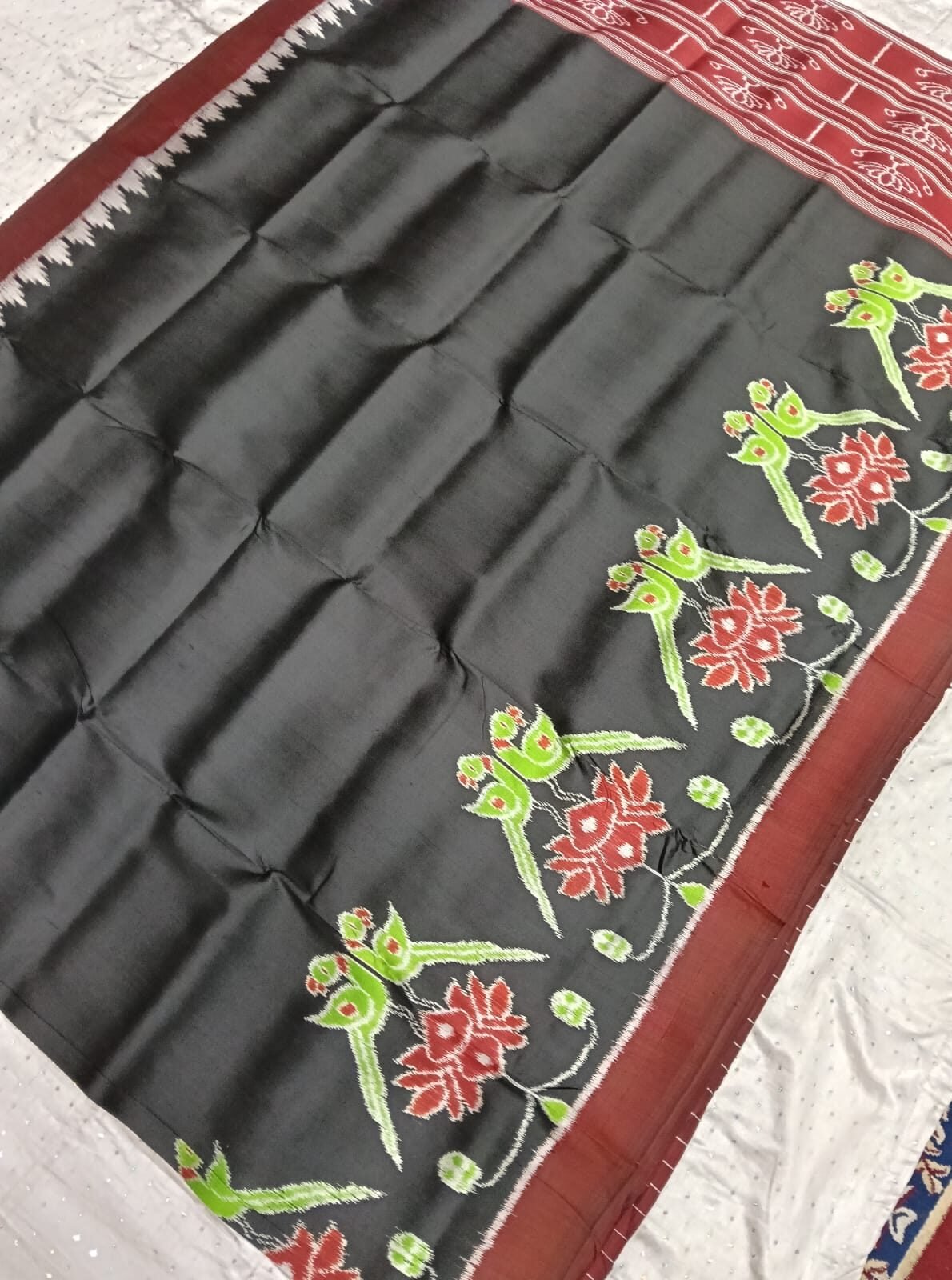 Black and maroon border with green parrot khandua silk saree with blouse