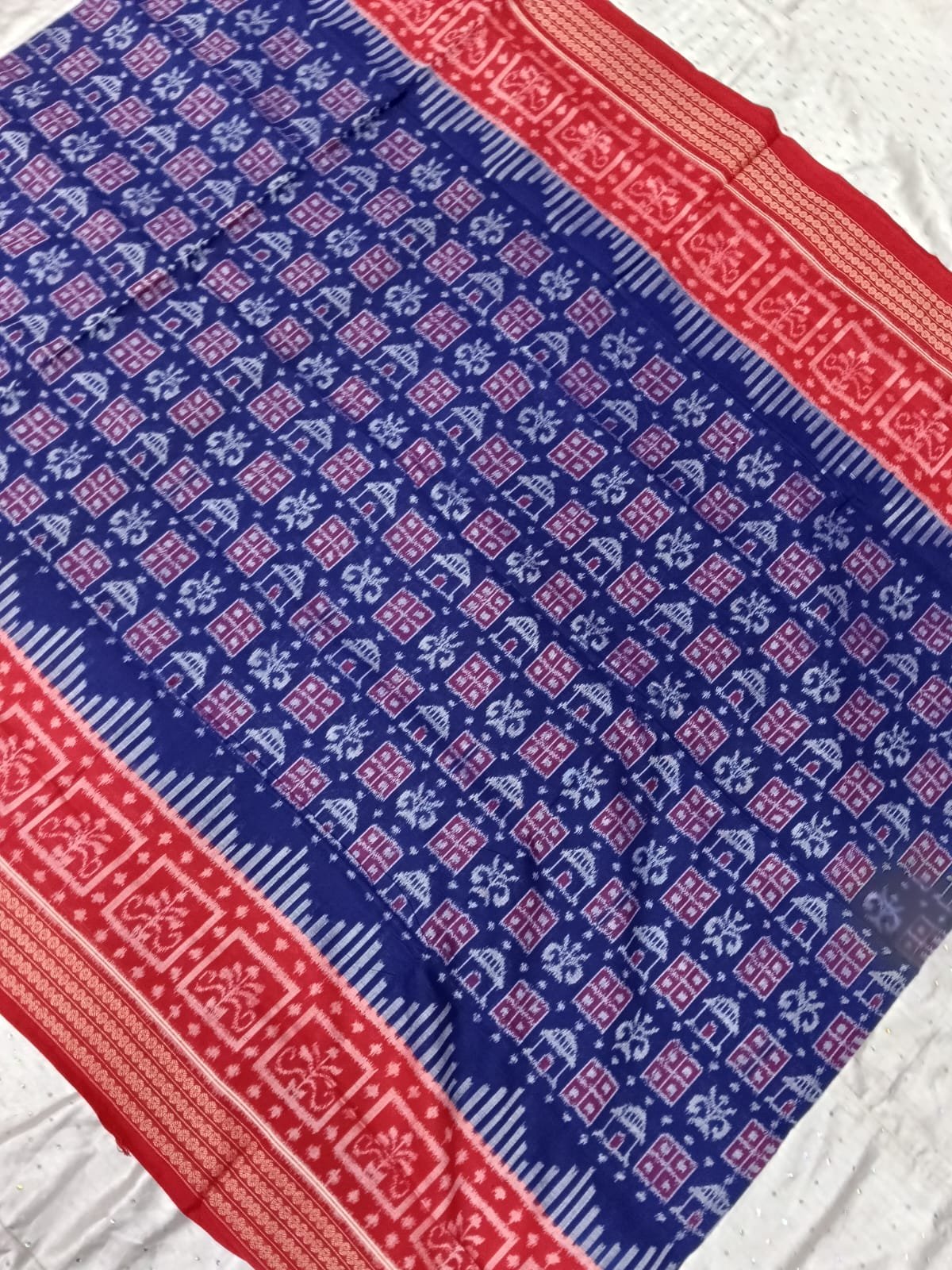 Blue and red house pattern sambalpuri cotton saree with blouse