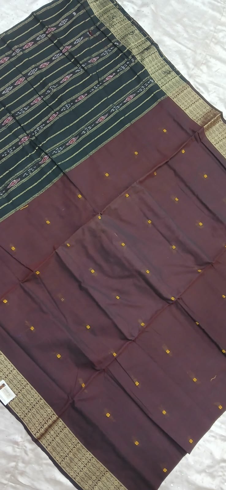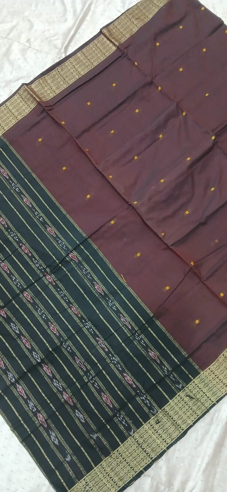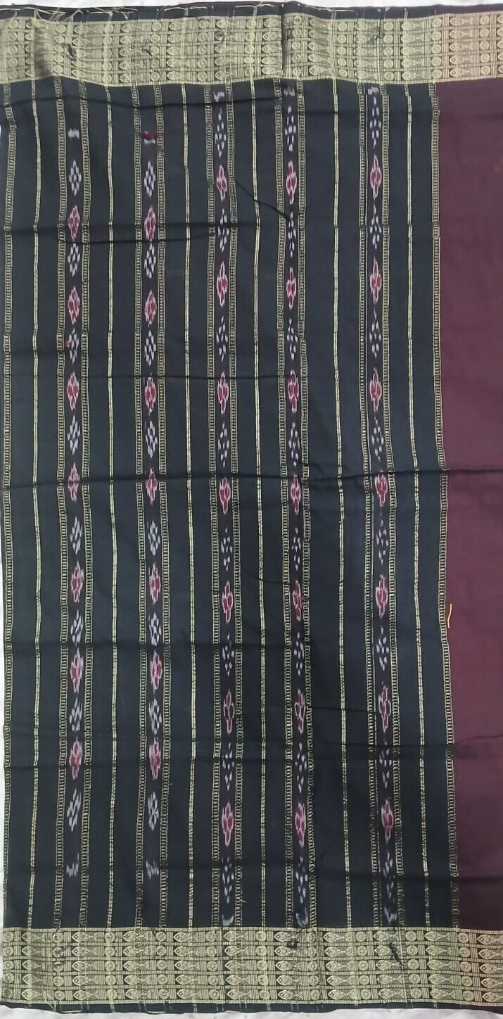 Coffee and black sambalpuri cotton saree with fish border