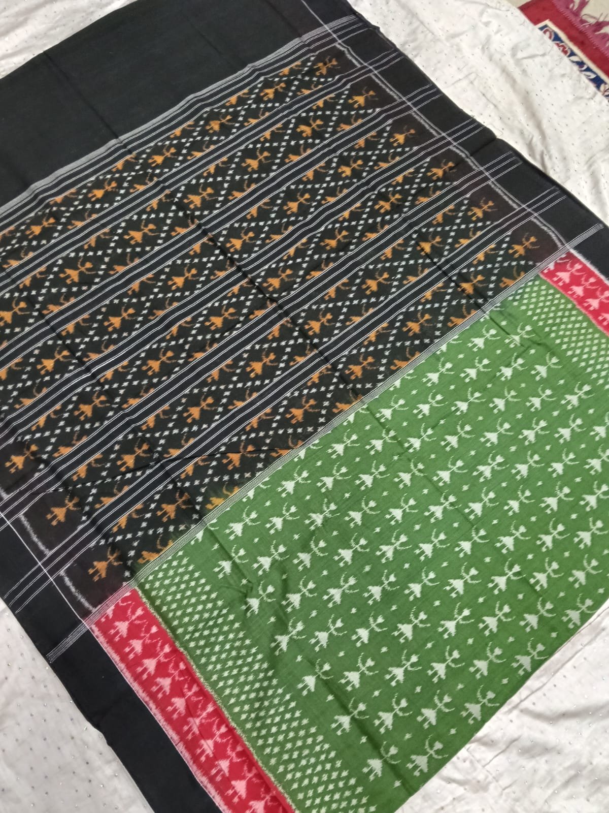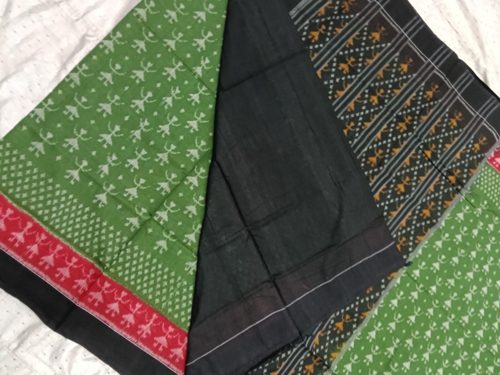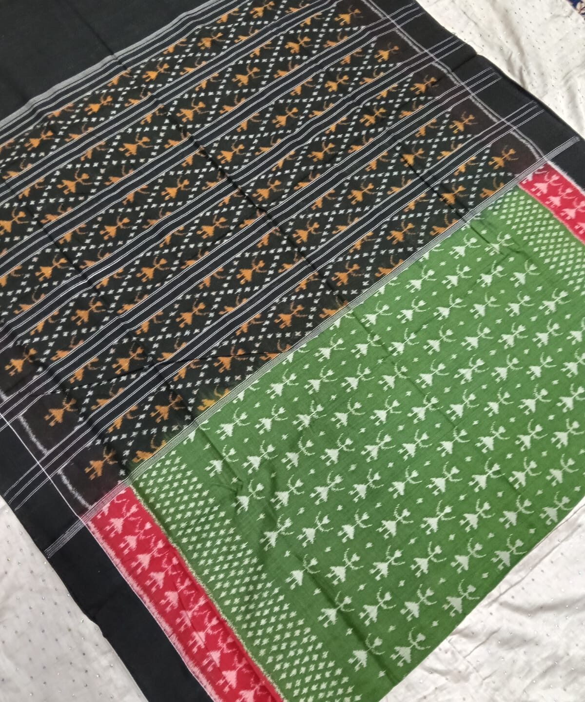 Green and black tribal art pattern sambalpuri cotton saree with blouse