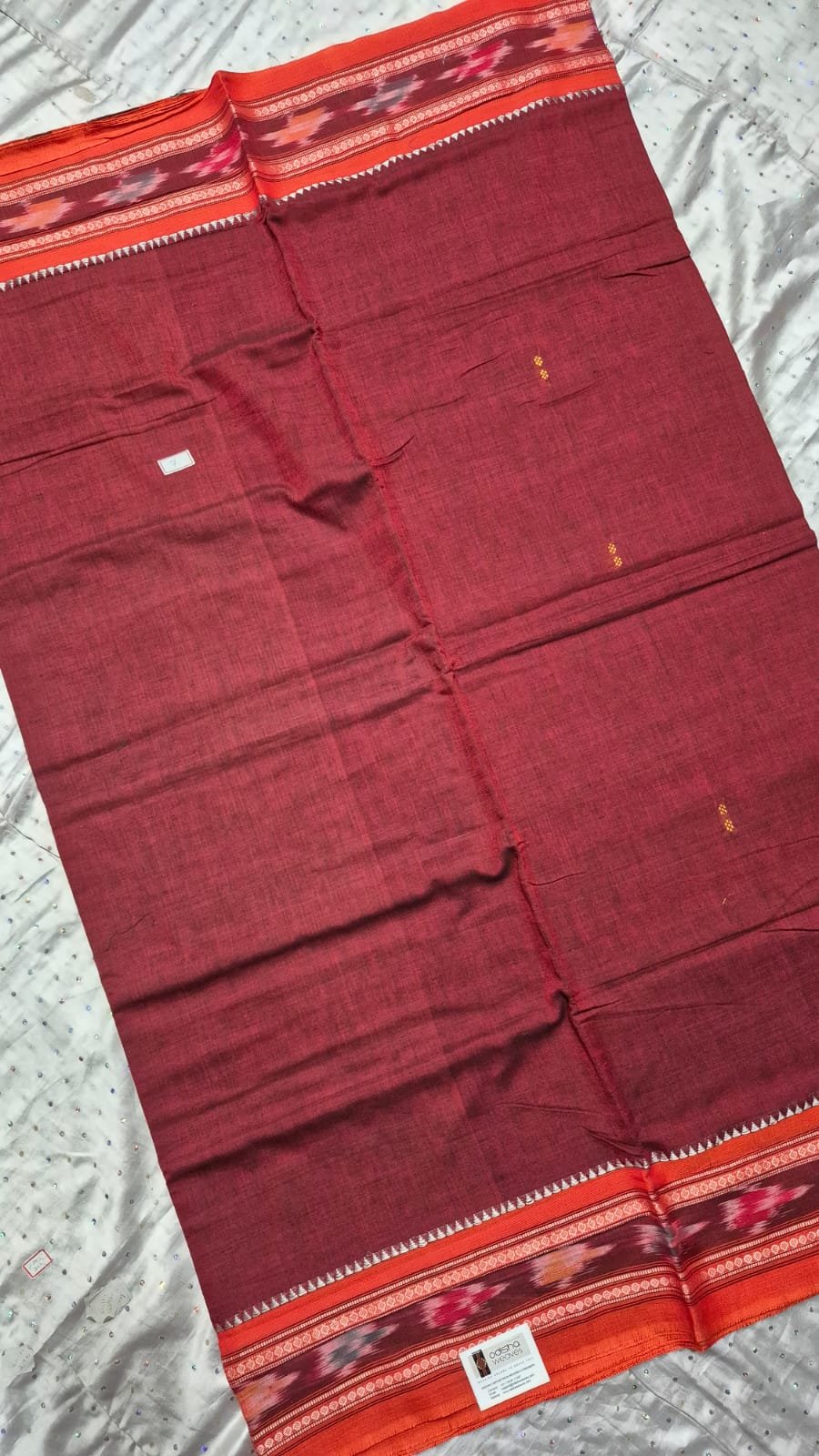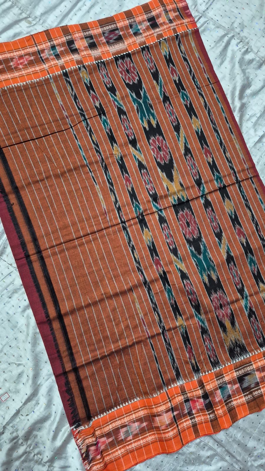 Maroon and orange sambalpuri cotton saree with saptapar border