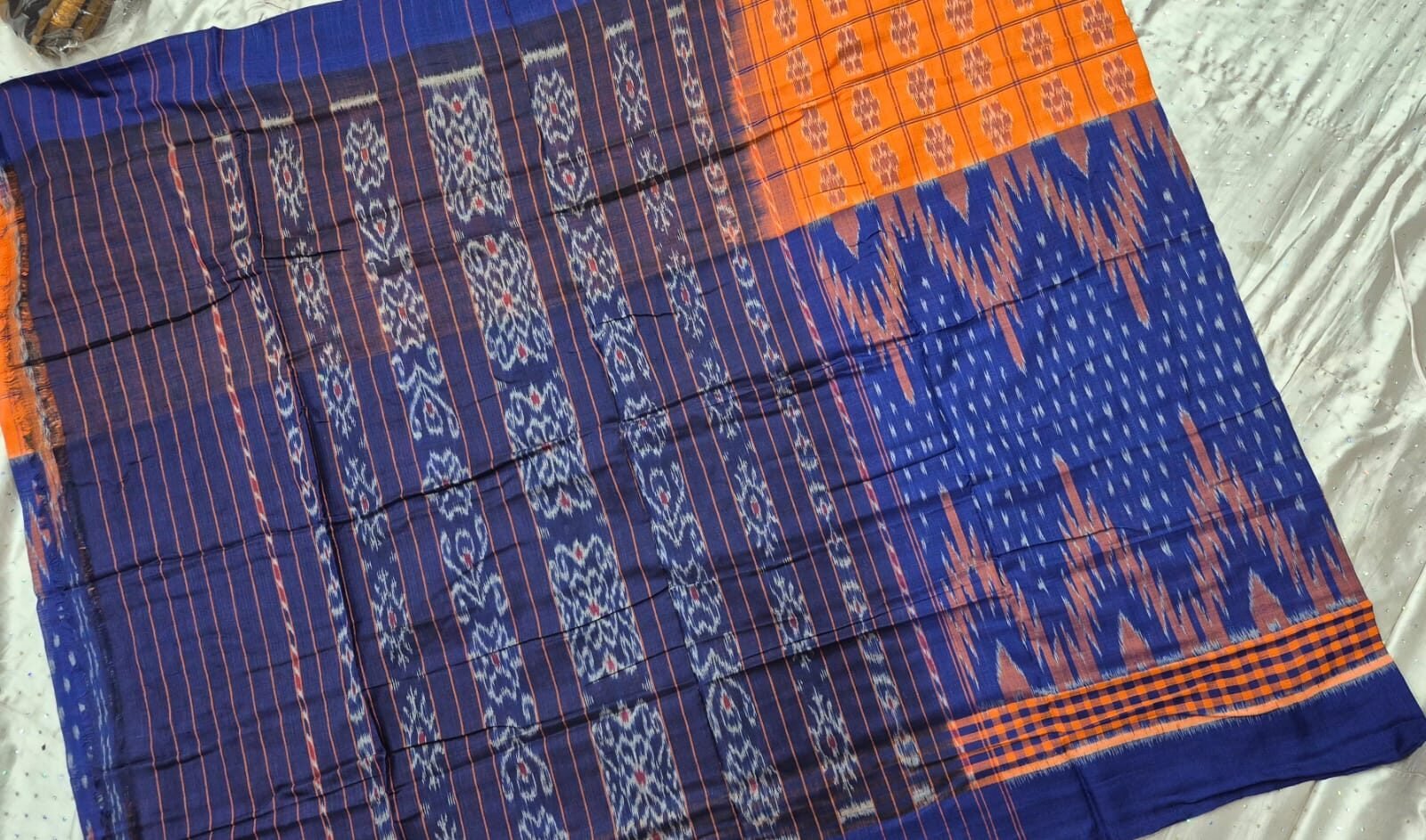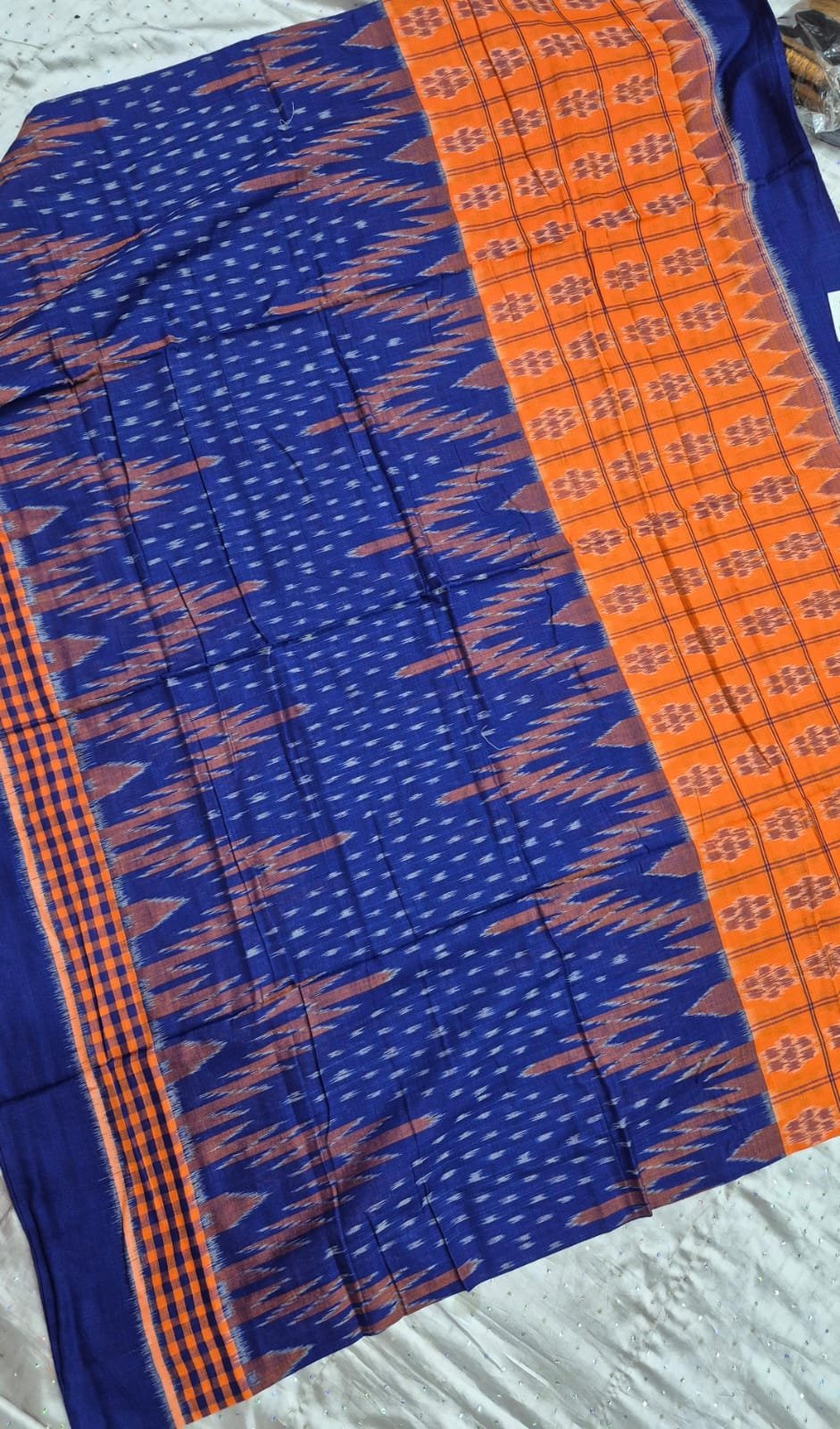 Orange and blue sambalpuri cotton saree with plain border