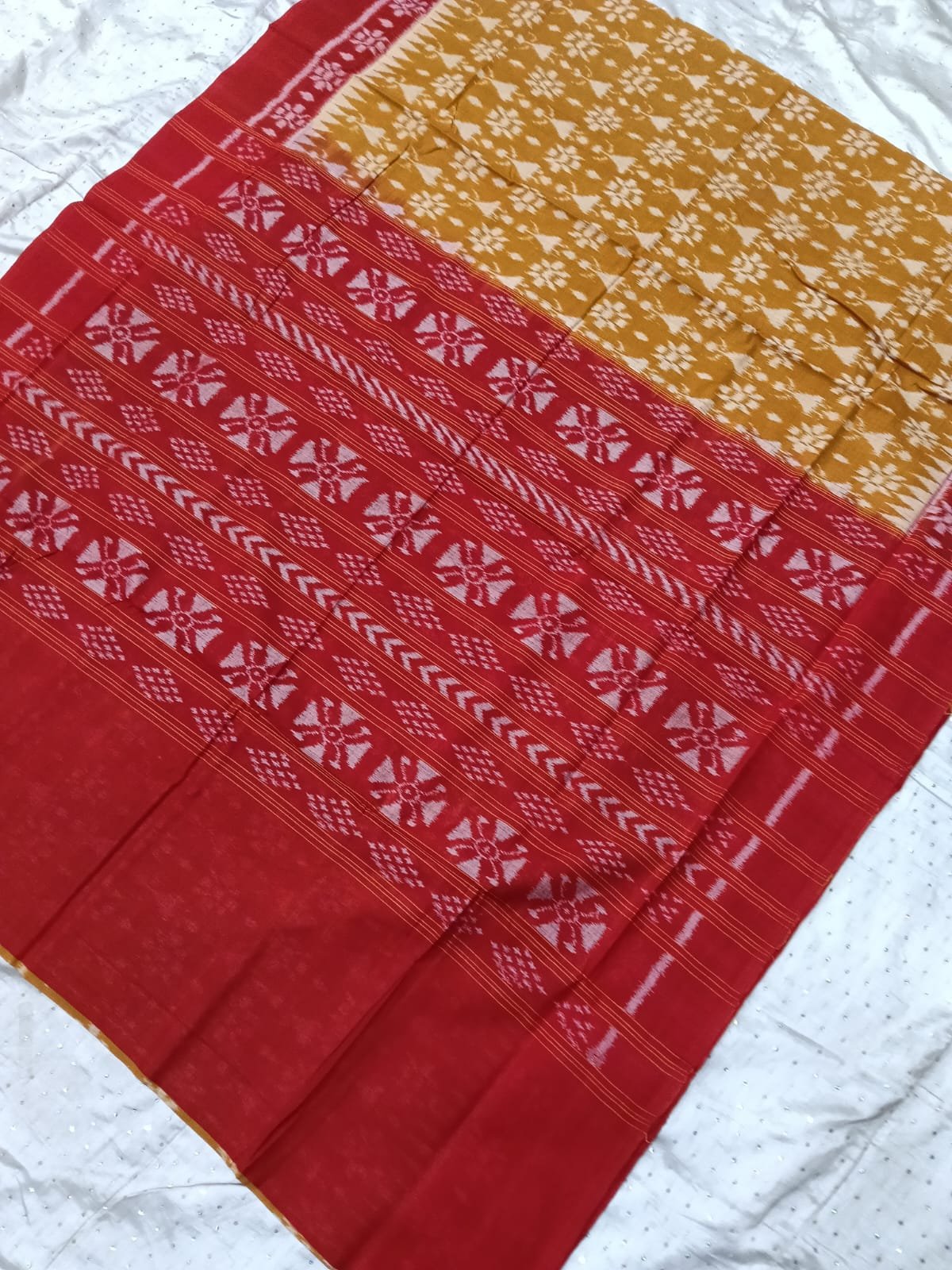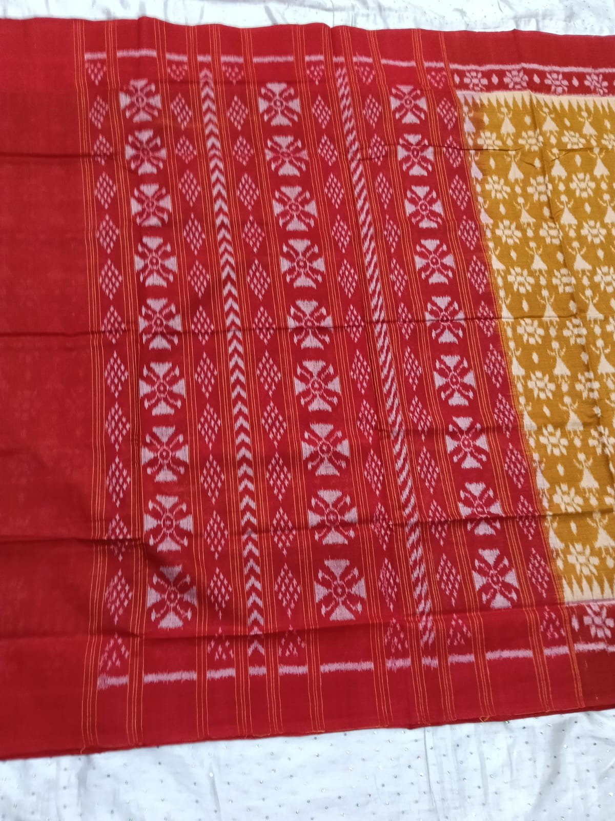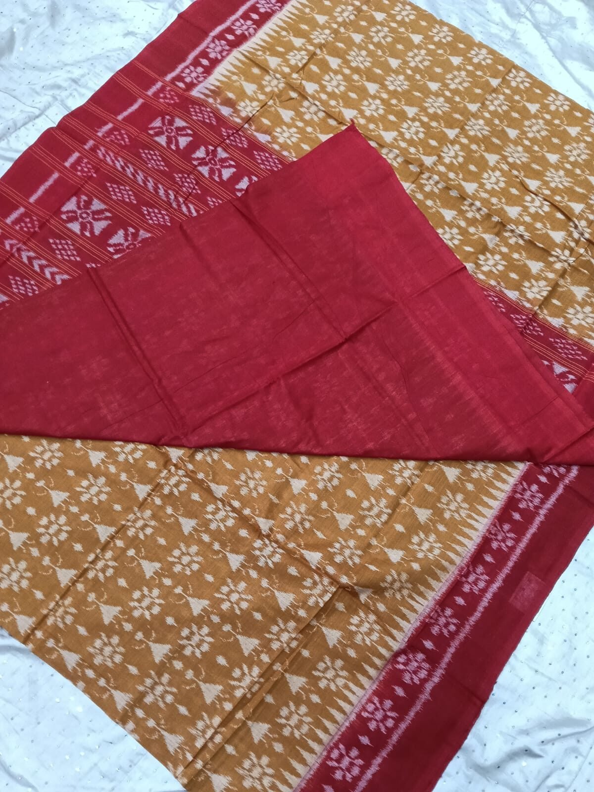 Yellow and maroon tribal art sambalpuri cotton saree with blouse